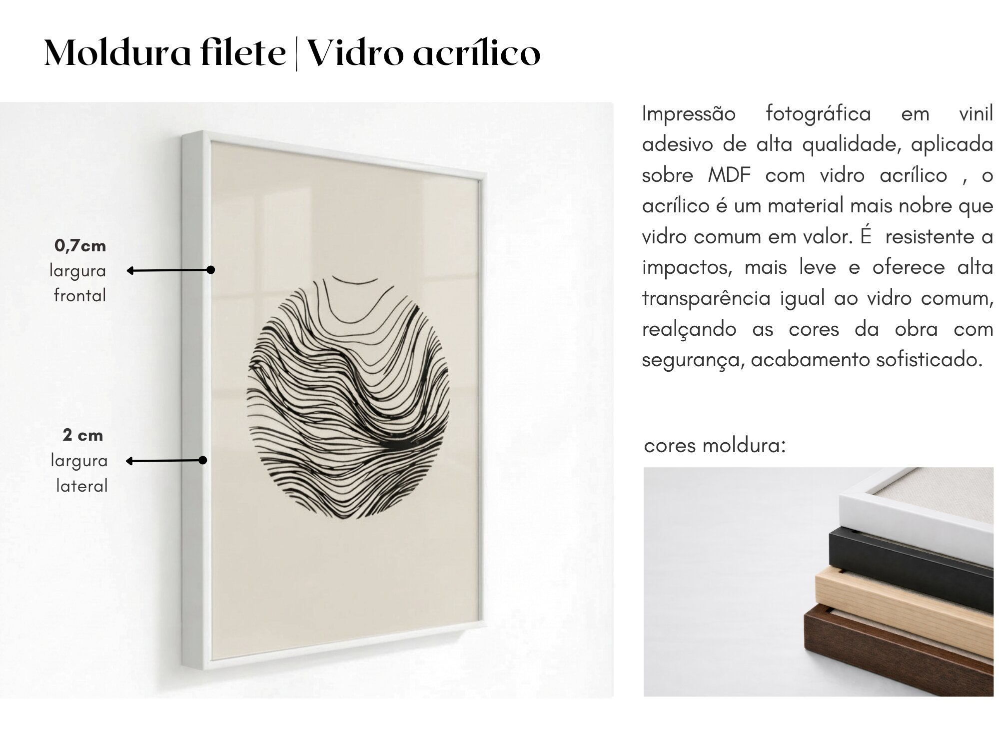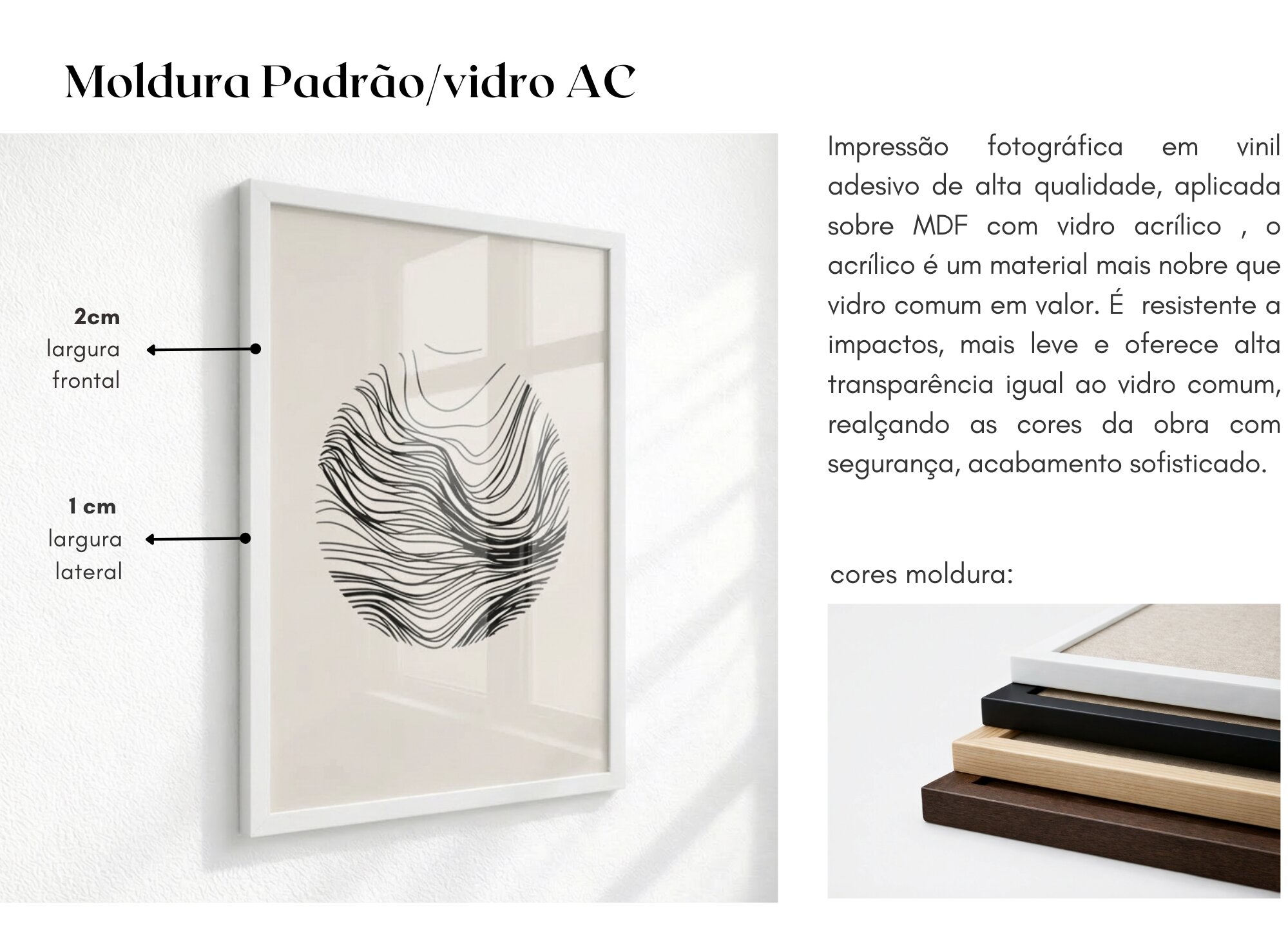 Impressão + Vidro Acrílico: Impressão vinil fotográfica aplicada sobre MDF e protegida por vidro acrílico, que é muito superior a vidro comum em valor agregado e até 17x mais resistente que o vidro comum, com alta transparência e mantém cores vibrantes.
